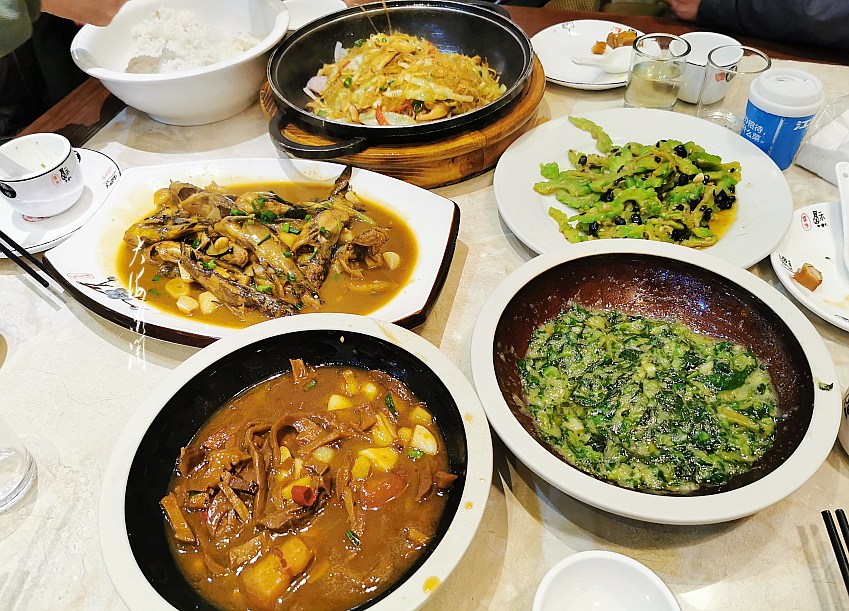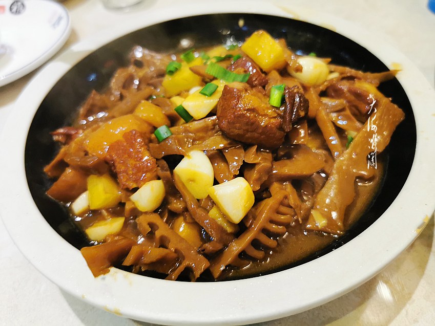 【笋干烧肉】一路上吃了不少肉炒笋片或者笋干烧肉,毕竟是这边的特产,感觉这家店的味道还是很棒滴,肉烂鲜香,香而不腻。笋干吸收了肉质的油脂,味道鲜美,口感不硬不老,做得非常入味,比肉都香,超级下饭菜。