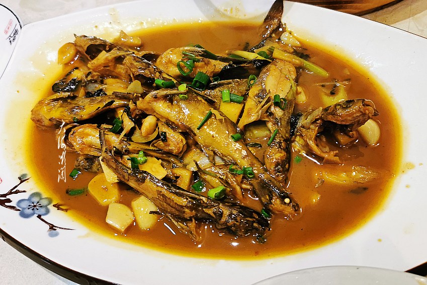 【红烧昂刺鱼】本来点的是红烧鲤鱼,后来没货了,改成红烧昂刺鱼。昂刺鱼在我们这边叫嘎牙子鱼,价格比鲫鱼还贵很多,感觉江西这边这种鱼还很多,就是个头小点,走到哪里都能吃到这种鱼。这道鱼烧得真心不错,口感不是很咸,但是很入味,鱼肉鲜嫩,味道鲜美,鱼汤泡饭好吃,别看鱼小,只有一根刺,老人小孩都能吃。