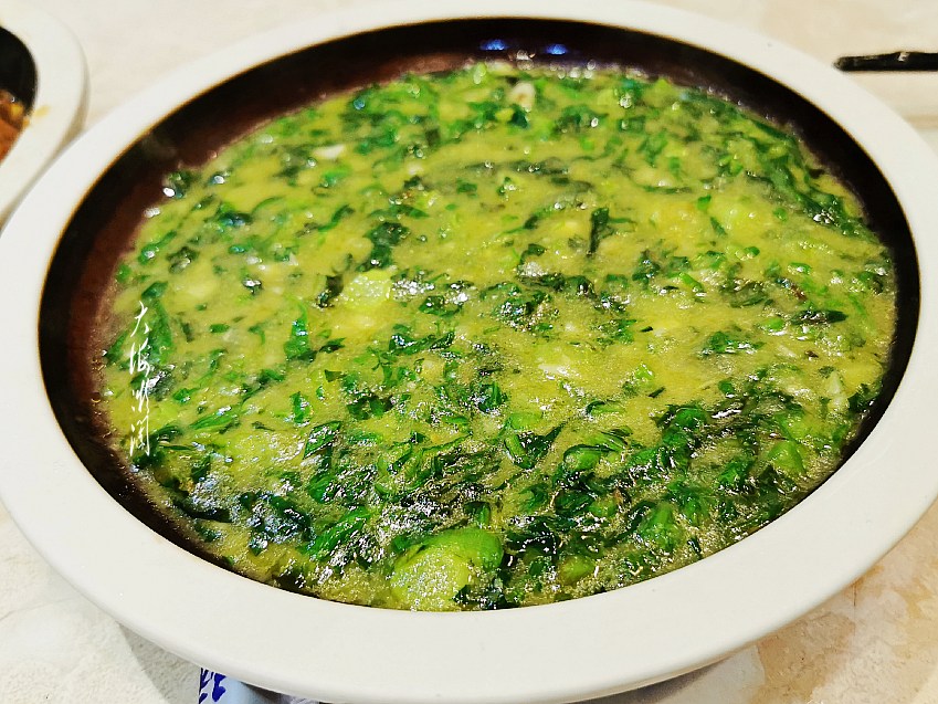 【米糊野菜】先上一汤,我就按照上菜的顺序来吧!这道汤点得太好了,热乎乎的米糊野菜汤,解渴又解饿,喝下去真舒服,清热去火菜,像是玉米面做的菜粥,问了一下服务员,这野菜叫苦荬菜,吃起来倒是没有明显苦的味道,还挺清香的。