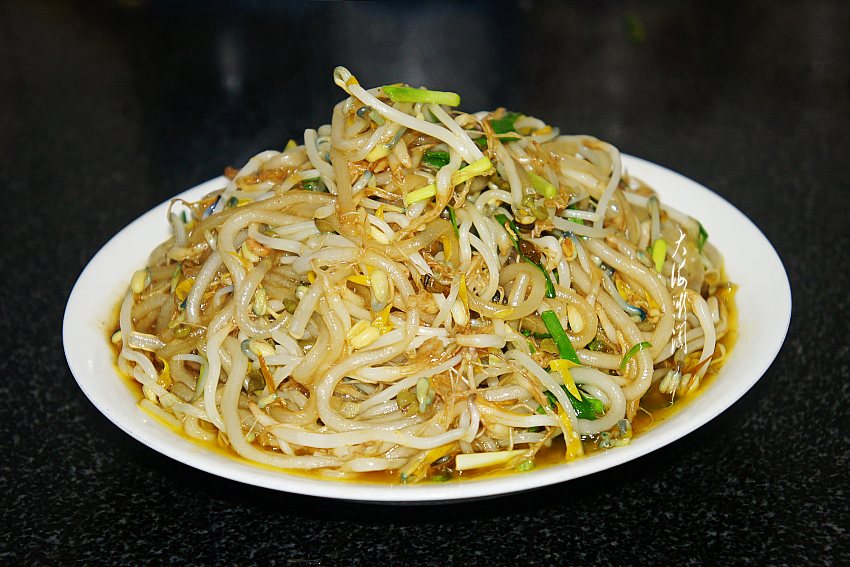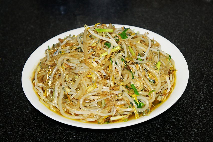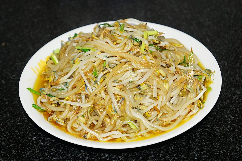 【绿豆芽炒粉条】所需食材:绿豆芽1小盆;粉条适量;油适量;葱姜适量;五香粉适量;醋适量;蒜苗适量。