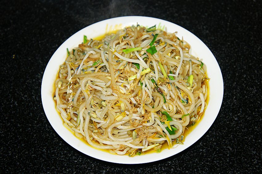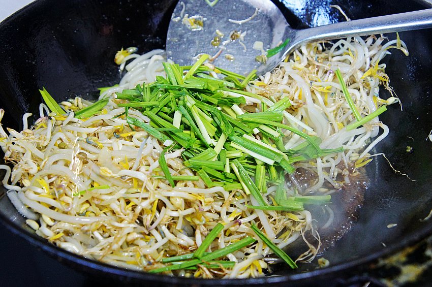 加入蒜苗翻炒两下,加入盐、醋调味。绿豆芽适合大火快炒,别炒过了,否则口感不脆。可以加点姜丝或加点醋调味,前者中和寒性,后者防止维生素的流失。