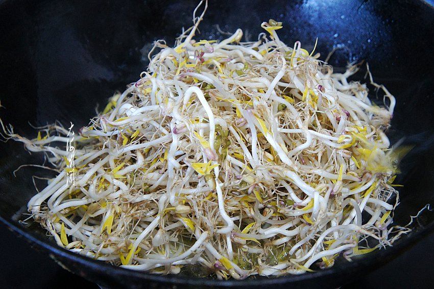 自己生发的绿豆芽5天左右就可以开吃了,一次吃不完,它还会继续生长,且后期生长非常快。准备一盆绿豆芽,反复清洗两次,根须可以去掉,直接炒也行,不够美观,但是还有营养。