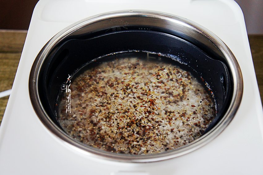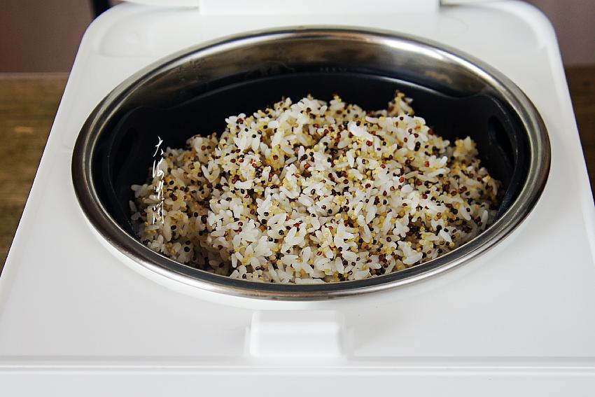 然后加入浸泡好的藜麦米,搅拌均匀。加入适量的水,今天米多,水位到3的位置。