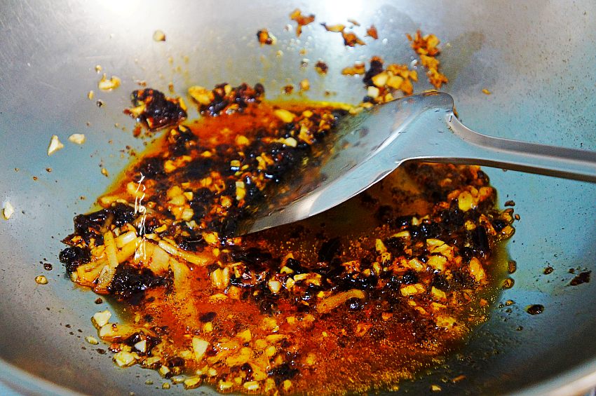 锅中加入适量的油,下入姜蒜末翻炒出香味,下入麻辣小龙虾底料,炒出香味和红油。