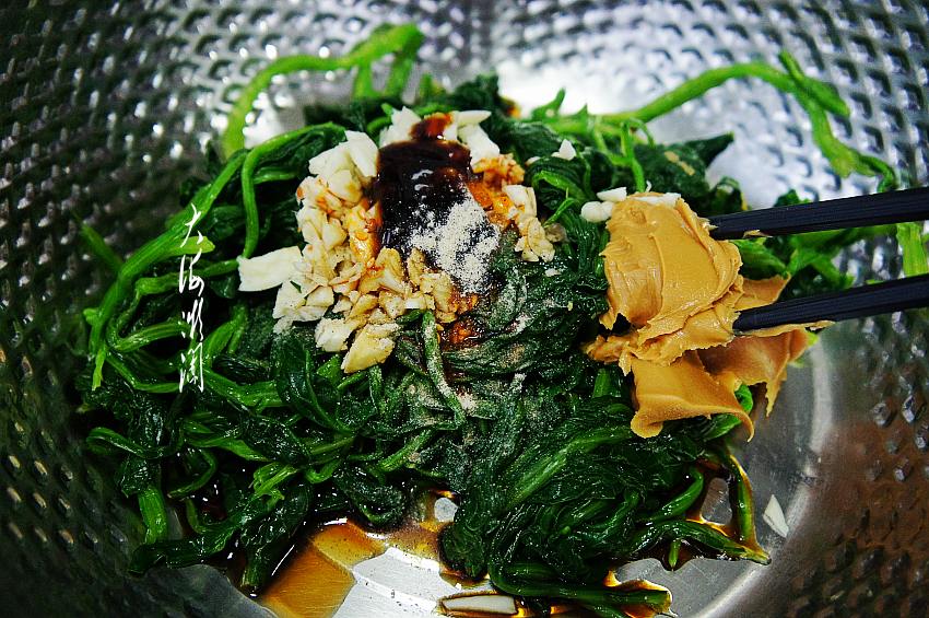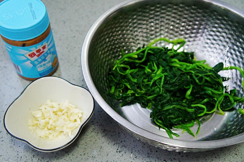【花生酱拌菠菜】所需食材:菠菜1捆;花生碎适量;蒜适量;花生酱适量;蚝油适量;盐适量;糖适量;生抽适量;醋适量。