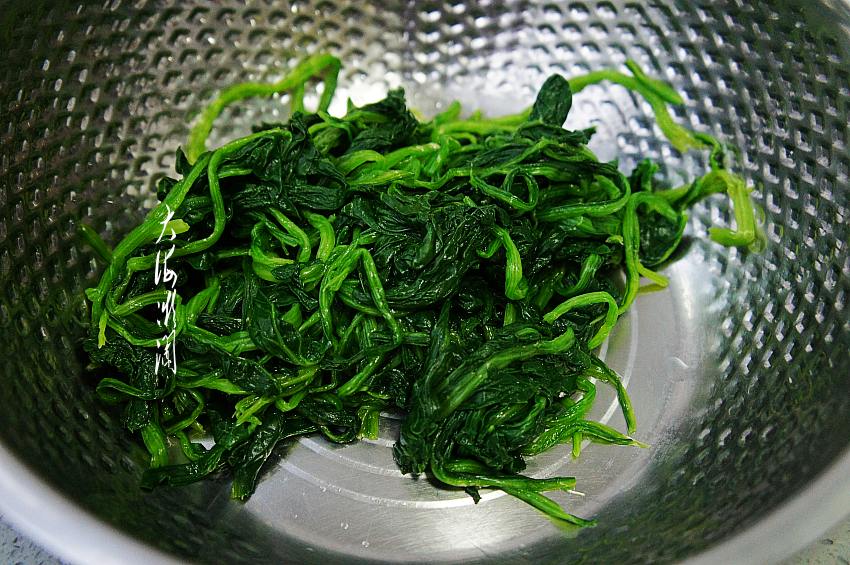 菠菜焯水后,捞出过冷水,攥掉水分。喜欢的可以切段儿,不切也可以,我选的都是菠菜叶。