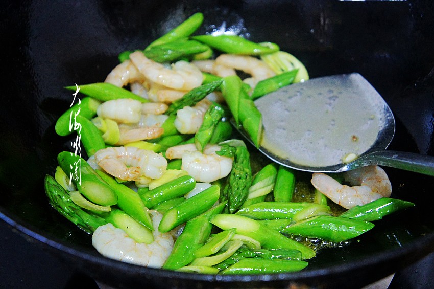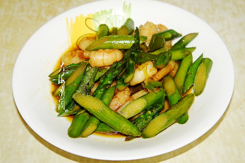 【虾仁炒芦笋】所需食材:芦笋1把;虾仁适量;油适量;生姜适量;六月鲜10克青盐原汁酱油适量;料酒适量。