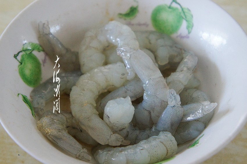 冷冻的虾仁解冻后,检查一下,看看虾线是否处理干净,然后反复清洗干净,控净水分,放入碗中,加料酒和姜丝拌均匀,腌制10分钟。虾仁含有丰富的蛋白质、钙,而脂肪含量较低,易消化,有益肾、补钙、健脑、增强人体免疫力的功效。