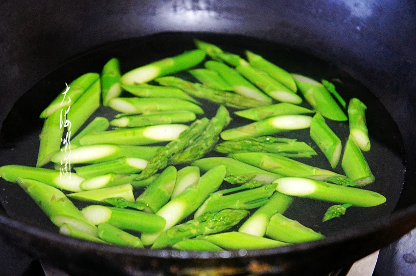 清洗干净的芦笋,斜切段。锅中加入适量的水,水开下入芦笋,在沸水中焯2分钟,捞出过冷水控净水分。
