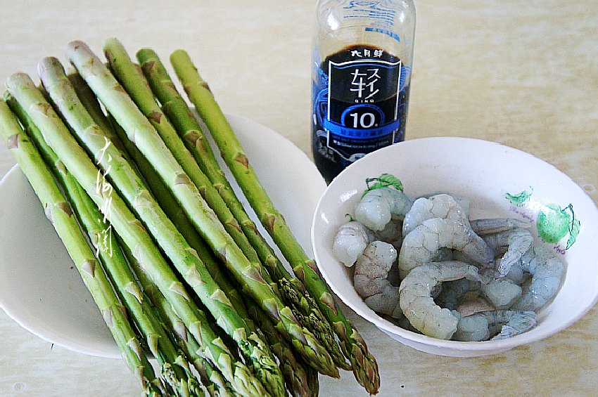 准备食材,早市买的芦笋,价格不贵,10元1斤,还很鲜嫩,清理干净后,在淡盐水中浸泡10分钟,然后清洗干净。冷冻的虾仁提前解冻。