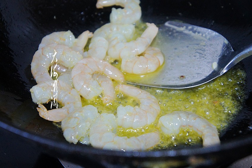 锅内加入适量的油,滑入虾仁,炒至变色。