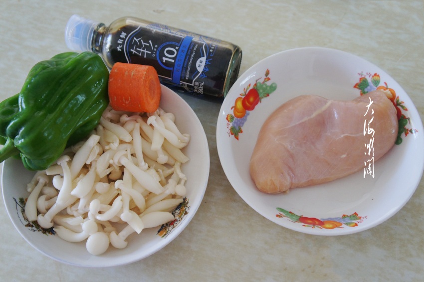 准备食材,买回来的鸡胸肉反复清洗干净,白玉菇去掉根部,淡盐水中浸泡10分钟左右,然后清洗干净,胡萝卜去皮洗净,青椒清洗干净。