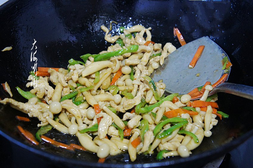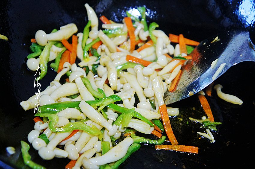 下入青椒丝翻炒,然后下入白玉菇翻炒均匀。