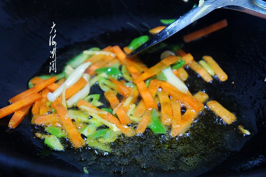 青椒切丝,胡萝卜切条,葱姜去皮洗净切碎。