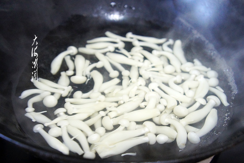 锅中加入适量的水,水开下乳白玉菇焯水,然后捞出过冷水控净水分。