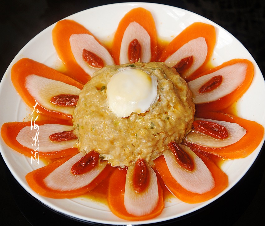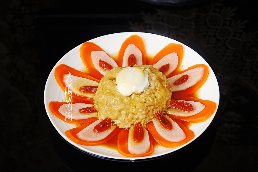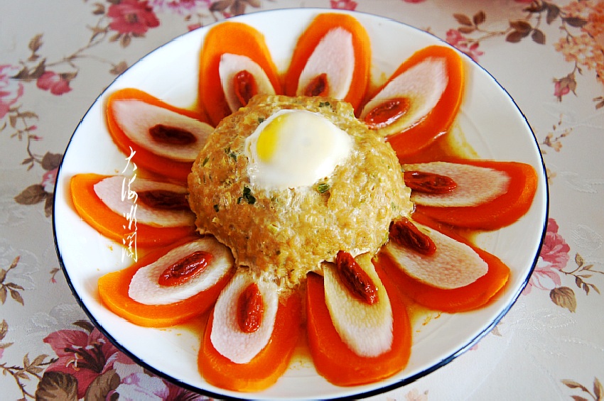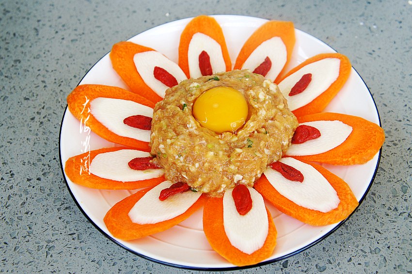 带上一次性手套,把肉馅抓匀,团成肉丸放在盘中间,再调整一下周边的胡萝卜片,肉馅中间挖个洞,放入蛋黄。