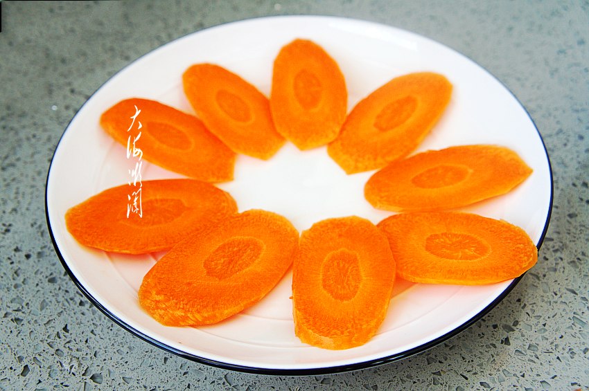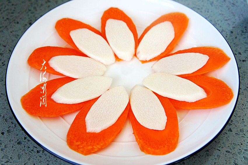山药斜切薄片,和胡萝卜切片相同,码在胡萝卜的上边,有层次感。