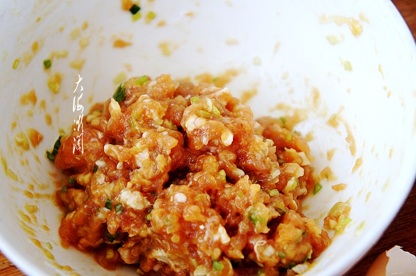 准备肉馅,鸡蛋蛋清蛋黄分离,猪肉馅加少许料酒、葱、姜、五香粉、胡椒粉、生抽、蚝油、香油沿一个方向搅拌上劲,适量加点蛋清搅拌均匀。然后加入适量的淀粉增加黏稠度,不用加盐,最后还要浇汁。