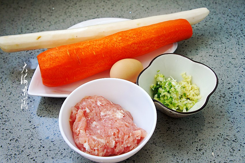 准备食材:胡萝卜、山药都去皮,洗净备用,里脊肉洗净剁成肉泥,或者用料理机绞成肉泥,葱、姜去皮洗净切末。