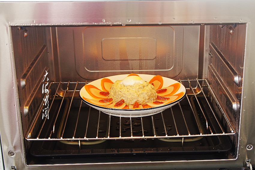 蒸烤箱水箱加入适量的水,将准备好的山药胡萝卜蒸蛋放入蒸箱下层。接通电源,启动开关,选纯蒸鱼功能,100度蒸15分钟。或者用蒸锅,水开蒸15分钟。