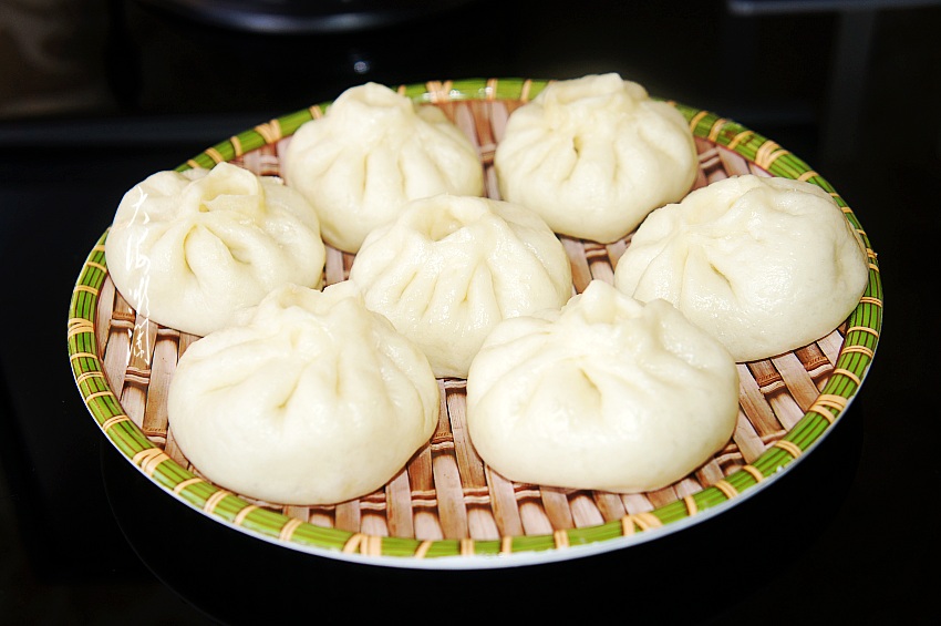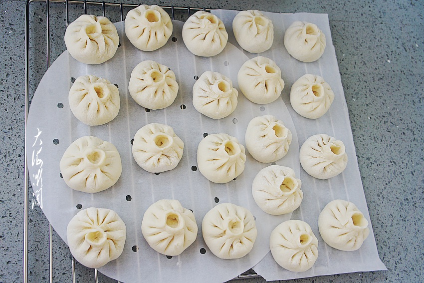 所有的包子都包好,蒸帘铺上油纸,码入包子。
