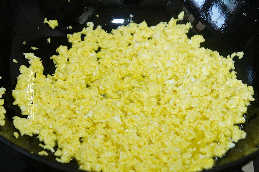 鸡蛋打散,加点料酒,搅拌均匀,这是鸡蛋不腥的最好方法,无论是做鸡蛋、鹅蛋还是鸭蛋,都可以这样操作,不腥口感还鲜嫩。炒锅加入适量的油,油开倒入蛋液,迅速用筷子搅散,越碎越好。然后出锅,晾凉备用。