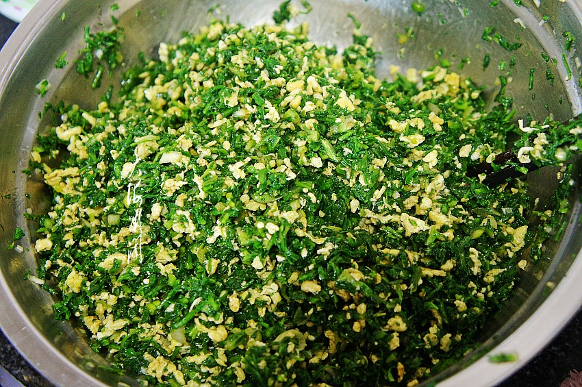 新采摘的荠菜,去掉杂质,清洗干净。锅中加入适量的水,水开加一勺盐,滴几滴油,下入荠菜焯烫1分钟,然后捞出过冷水,控净水分,切碎。