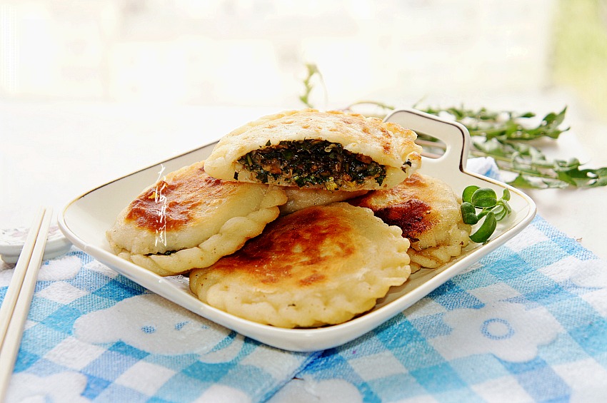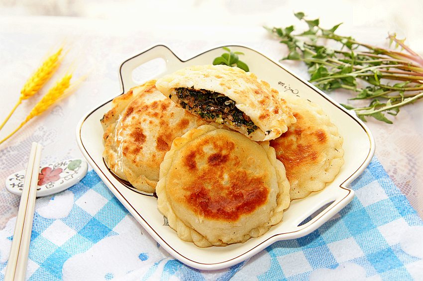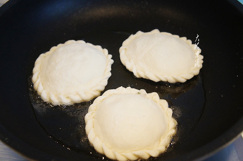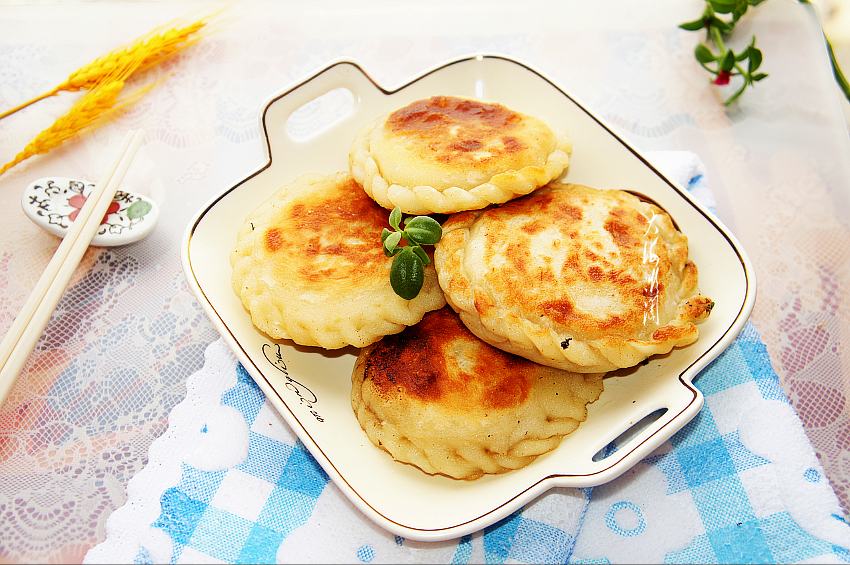 平底锅薄薄地刷层底油,码入包好的馅饼,小火慢慢地煎。