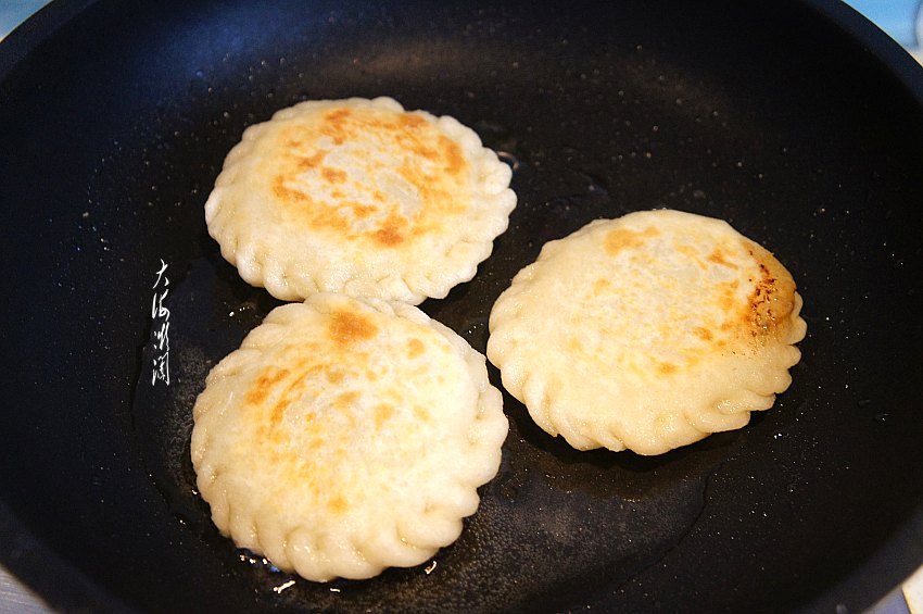 翻面煎,因为是肉馅,需加小半碗水,盖上锅盖焖一会,这样保证里边的肉馅熟透。素馅可以减少这一步,很容易烙熟。