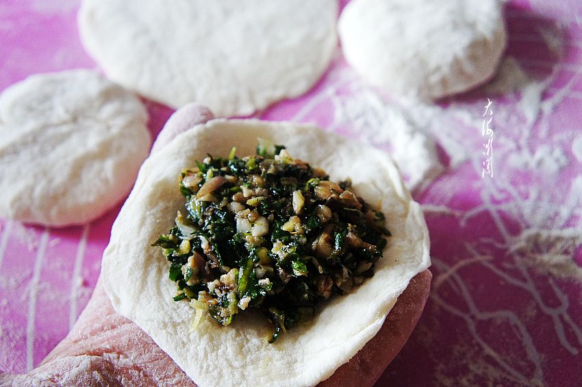 取一份面剂子擀成饼,包上馅,再放上一张面皮,合起来捏在一起,然后捏出花边,这花式也叫太阳花盒子。