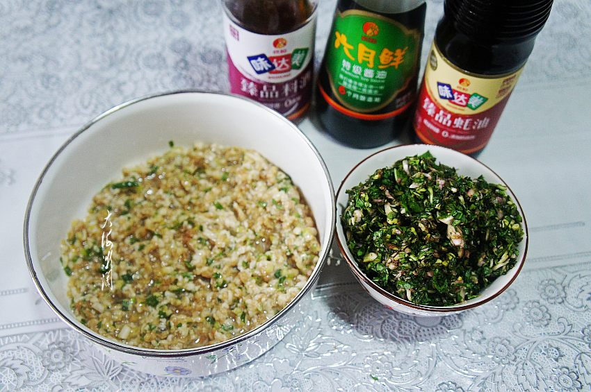 将婆婆丁碎加入到肉馅中,搅拌均匀。