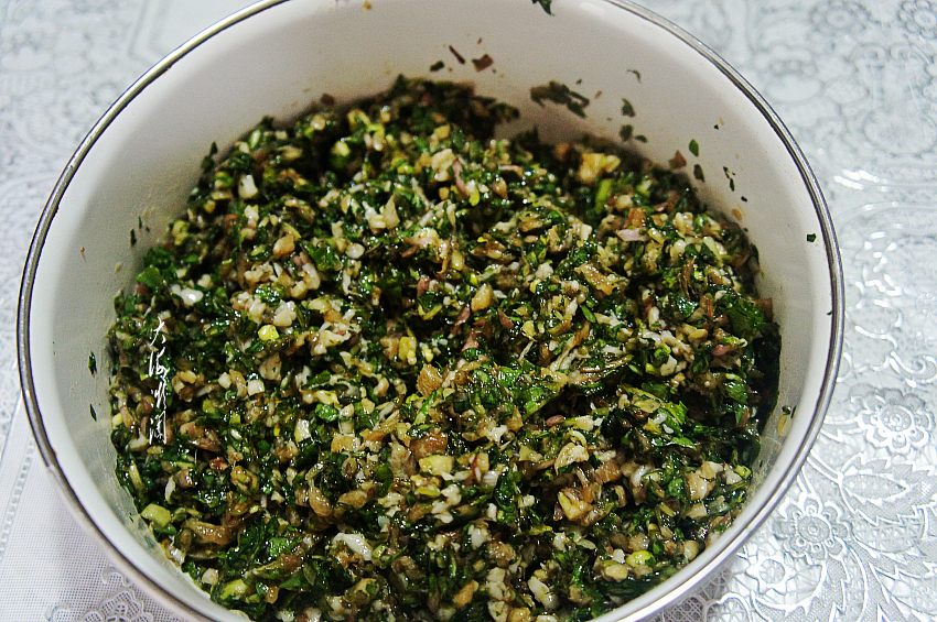 新采摘回来的婆婆丁,去掉杂质,清洗干净,不用焯水,切碎,然后加点盐腌制10分钟左右。