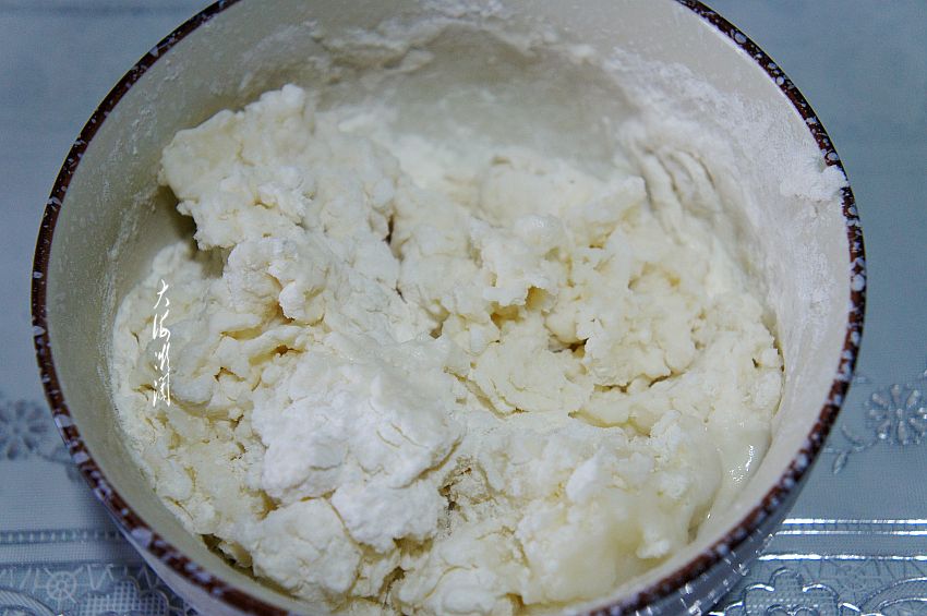 面粉一分为二,一半烫面,一半加入适量的水和成面团,盖上保鲜膜饧着。如果早餐吃馅饼,可以前一天晚上就和好面饧着,第二天早上特别好用,家里温度高可以冰箱冷藏。