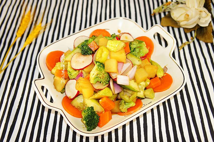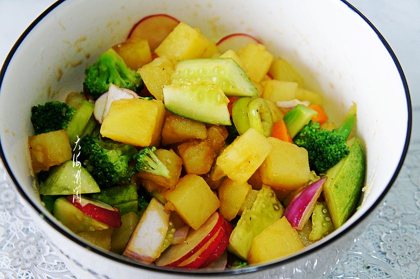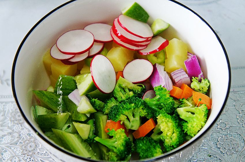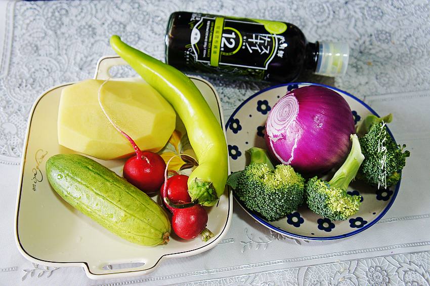 【蔬菜沙拉】所需食材:土豆1个;水果黄瓜1根;小水萝卜3个;西兰花沙拉;洋葱少许;辣椒少许;六月鲜轻12特级轻盐昆布酱油适量。