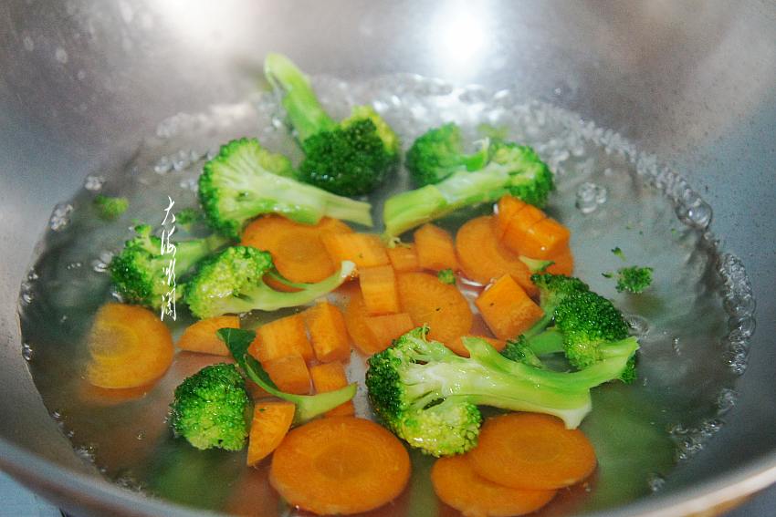 锅中加入适量的水,加入1勺盐,洗干净的西兰花下入锅中焯水,胡萝卜分别切片切丁,下入锅中焯水,然后过冷水。西兰花营养价值非常高,是备受女人们喜欢的减肥佳品。西兰花中的维生素种类非常齐全,尤其维生素A和胡萝卜素,西兰花中的胡萝卜素含量,甚至超出“胡萝卜”十倍之多。医学界认为西兰花对大脑、视力都有很好的作用,是营养丰富的综合保健蔬菜。经常看手机、电脑屏幕的人群,应多吃点西兰花。