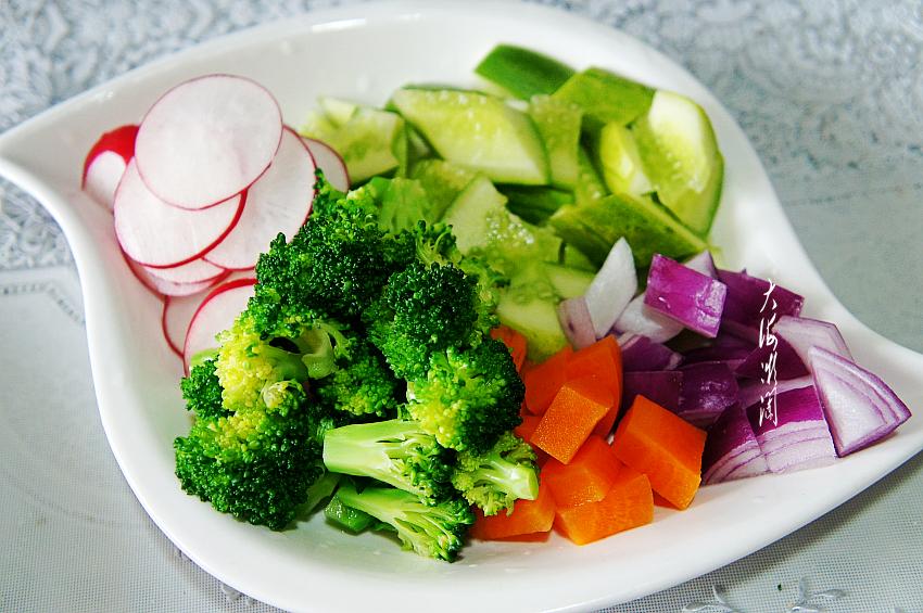 水果黄瓜切块,水萝卜切片,洋葱切片,焯过水的西兰花掰成小朵。