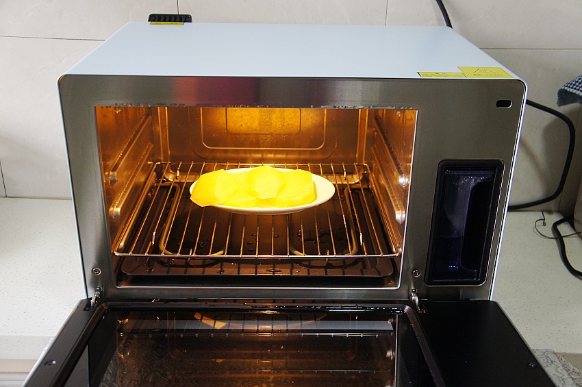 土豆切片送入蒸烤箱,100度蒸15分钟。土豆被称为“十全十美”的食物,也是众所周知的抗衰老的食物,有很好的呵护肌肤、保养容颜的功效。同时因含有丰富的膳食纤维,可以起到通便排毒和清肠刮油的作用。饱腹感强,热量很低,不仅能减少脂肪摄入,还能代谢多余脂肪,常食有减肥瘦身的功效。