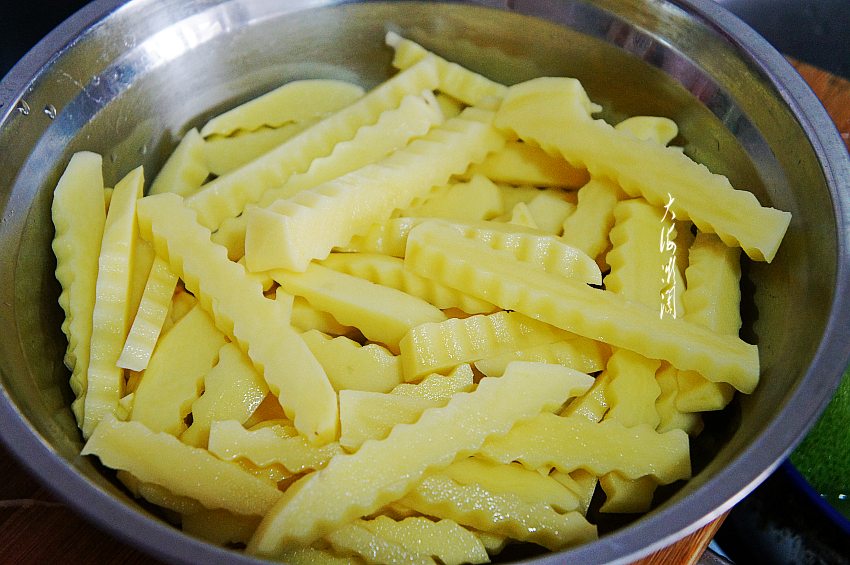 市场买来的土豆个头很大,2个一斤多,土豆去皮洗净,切条,宽窄薄厚都随个人喜欢的口感而定,但是粗细要尽量均匀一些,成熟度才会一致(这是第一步土豆切条)。