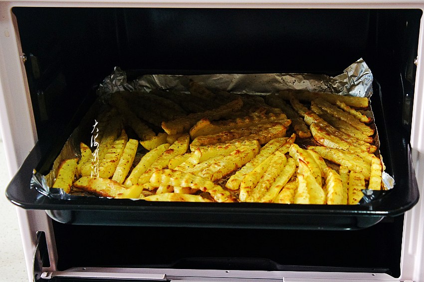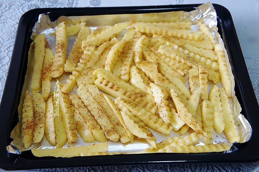 烤盘里面铺锡纸或者油纸,将土豆条摆放到烤盘里面,尽量平铺摆放,最好不要重叠起来。