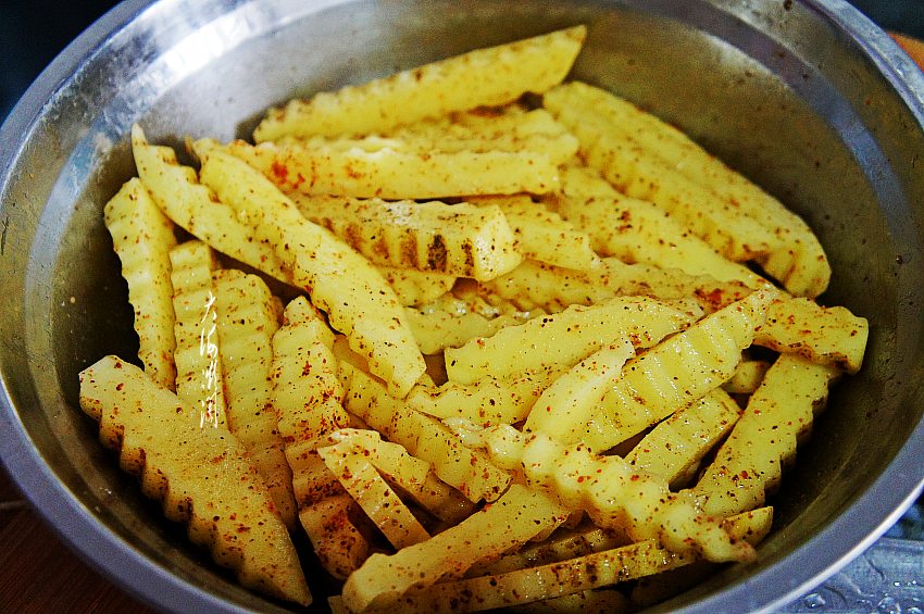 端起盆摇一摇,晃一晃,让每个薯条都裹上调味料(这是第二步,裹上调味料)。