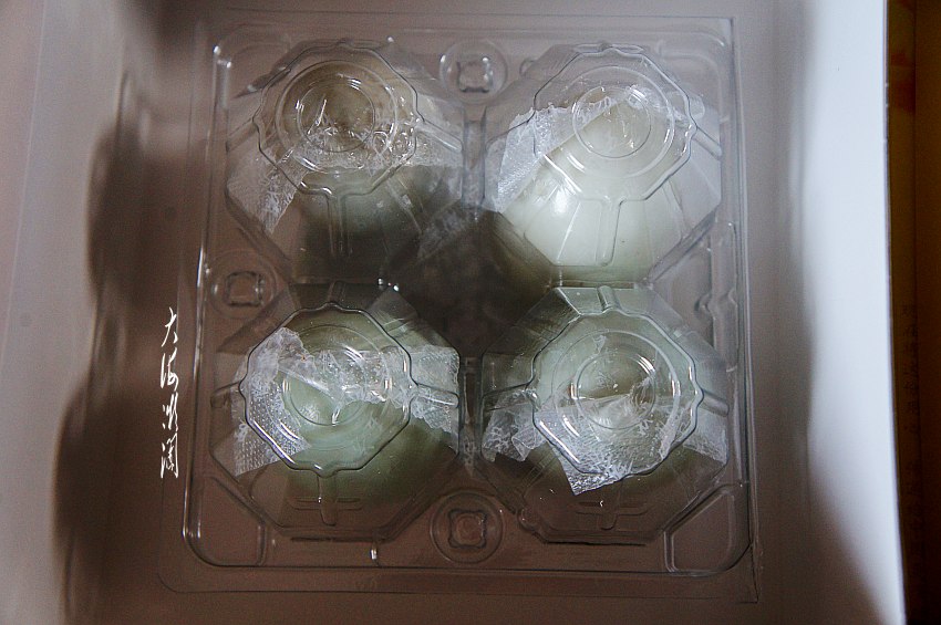 这两盒包装看着挺喜庆的吧,我喜欢。一盒是精致的绿豆糕,一个是咸鸭蛋,