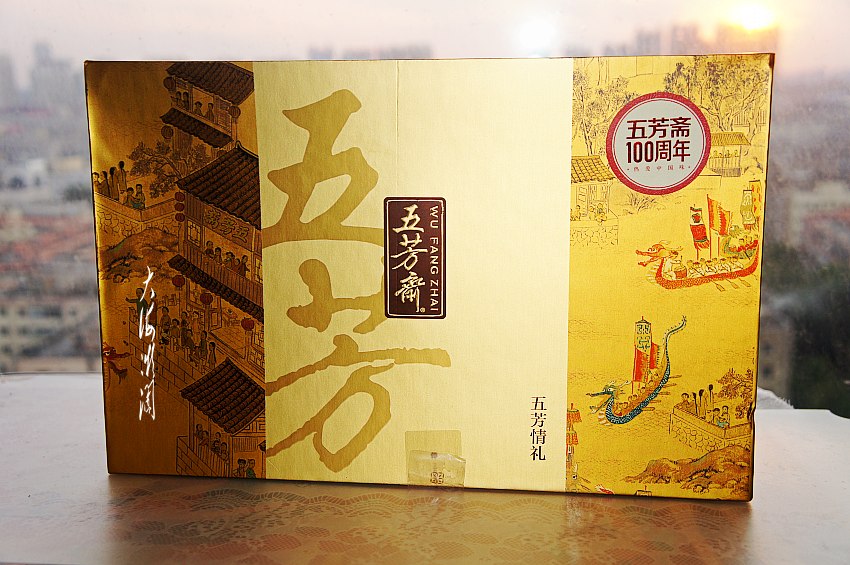 包装还蛮精致的,很有传统范儿,很喜庆,很有节日气氛,画面一眼望去就是端午节的礼盒。外层还有一个可以手提的纸质包装袋,五芳斋百周年纪念礼盒,看上去很有档次吧!吃到粽子的人一定会很开心。