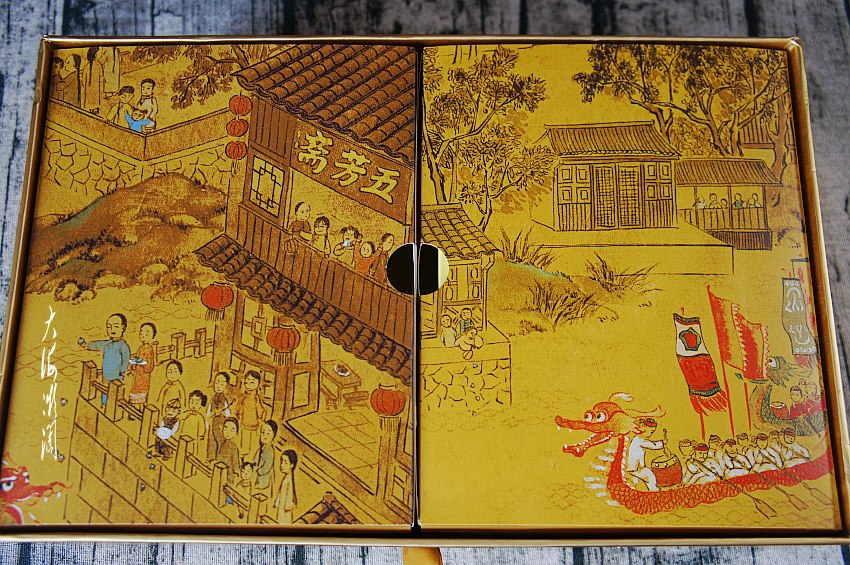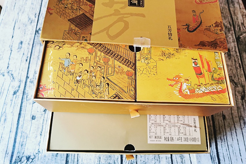 打开包装,里边包括两个礼盒,其中一个是粽子礼盒,另一个还包括两个小盒子,一边是绿豆糕,一边是咸鸭蛋。