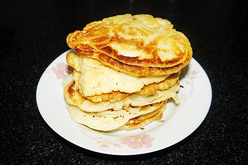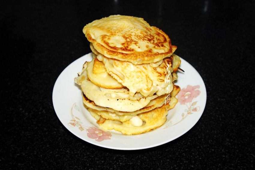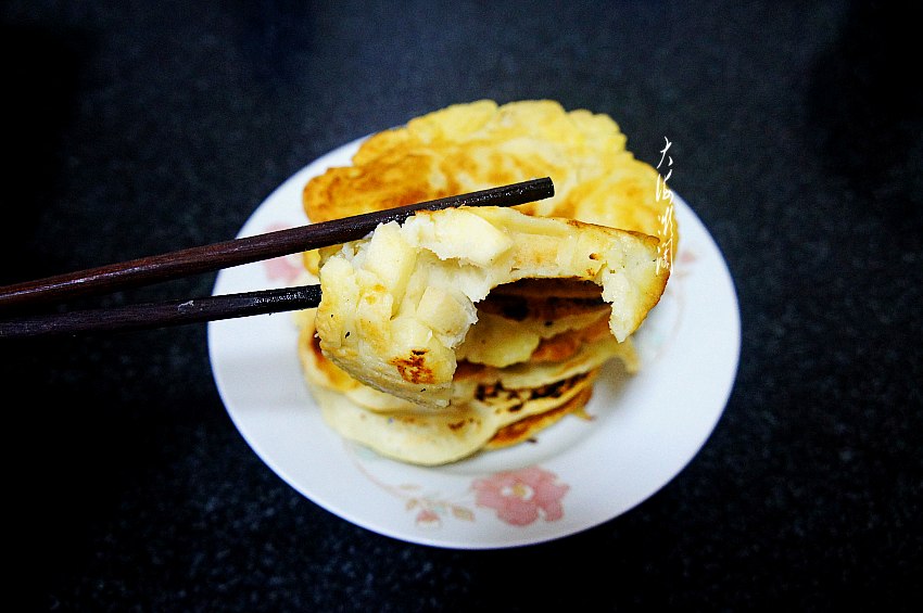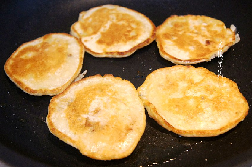 平底锅薄薄地刷底油,用大小适中的汤匙,舀一勺面糊放入锅中,轻轻压平,小火两面烙至金黄就OK了!出锅装盘,是不是超级简单。