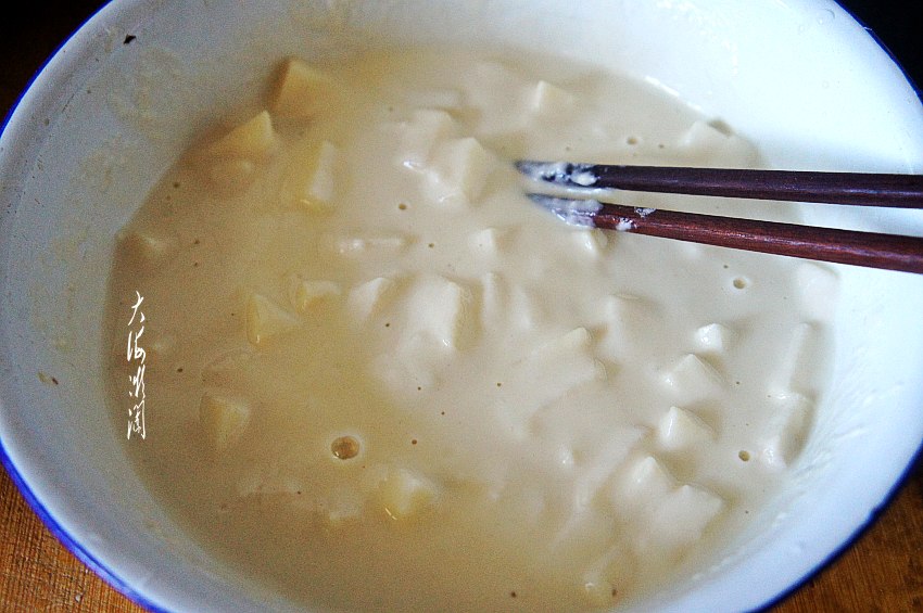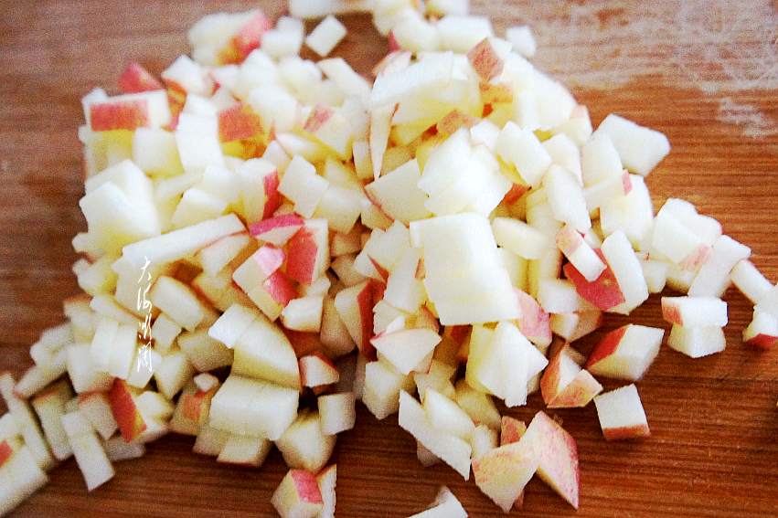 苹果洗净切丁,前边说过啦,夏季防晒苹果最好带皮吃,不但颜色漂亮,营养价值更高。那就下点功夫洗苹果吧!我通常的做法是先用面粉反复搓洗干净,然后放到淡盐水里浸泡10分钟左右,再反复清洗干净,就可以直接食用了。