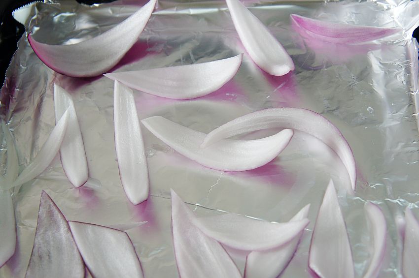 洋葱去皮洗净,切条,烤盘铺上锡纸码上一层洋葱条。