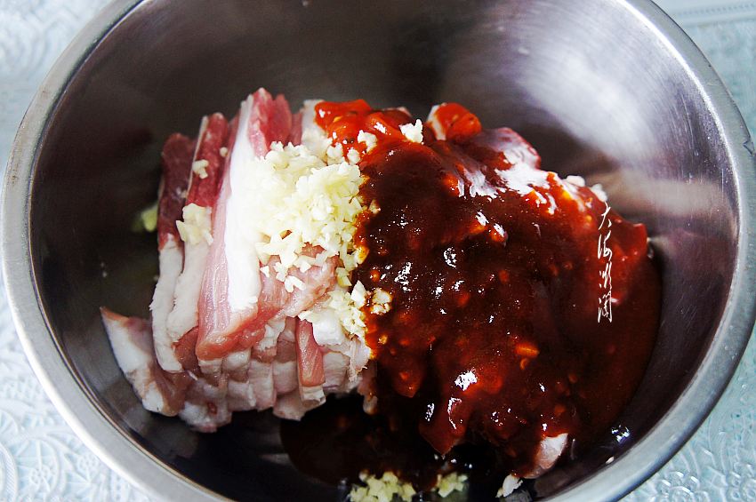 大蒜去皮洗净切成蒜末,姜去皮洗净切成姜末,准备一代烧烤酱,自己喜欢的品牌都可以,我用的是韩式烤酱。取大盆,放入切好的五花肉,加入姜蒜末,1勺蜂蜜,料理米酒1勺,加入适量的烤酱和辣椒酱。