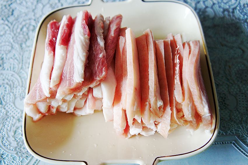 买回来的五花肉清洗干净,切片,薄厚随自己喜欢,可以略微厚一点,口感好,吃起来特别香,肉皮劲道。