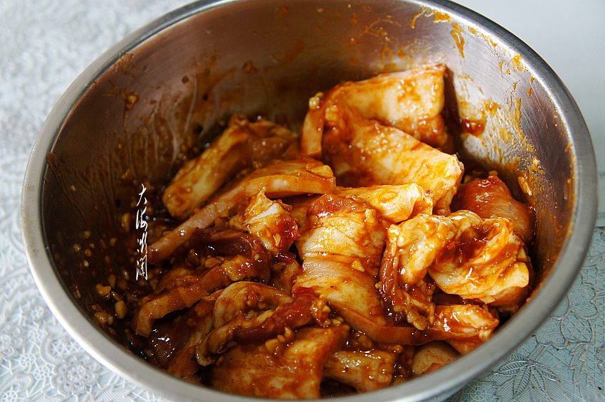带上一次性手套,抓一抓,让五花肉更入味,然后腌制半小时左右。