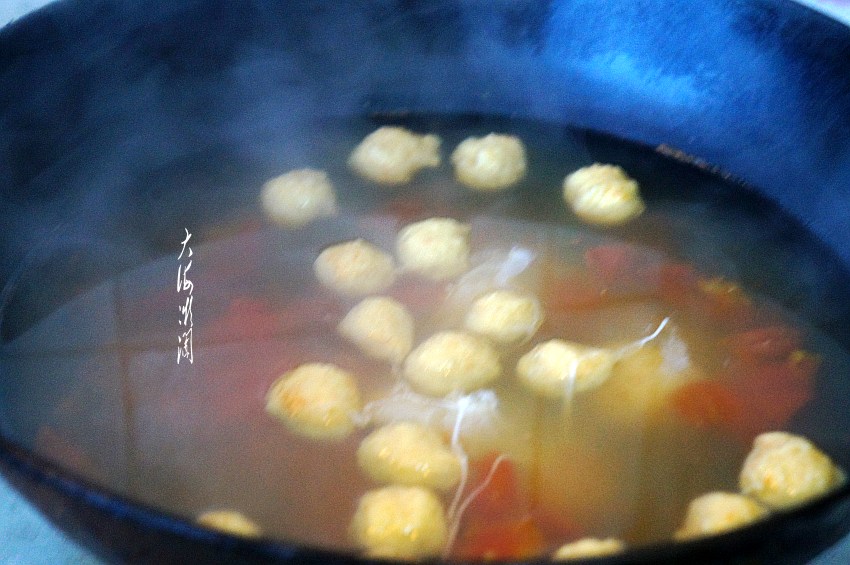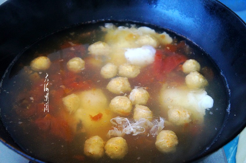 此时可以打开火烧水了,锅中加入适量的水煮开,关火打入3个荷包蛋,待荷包蛋基本凝固成形,再一次开火,下入西红柿和鸡肉丸,小火一起煮开。